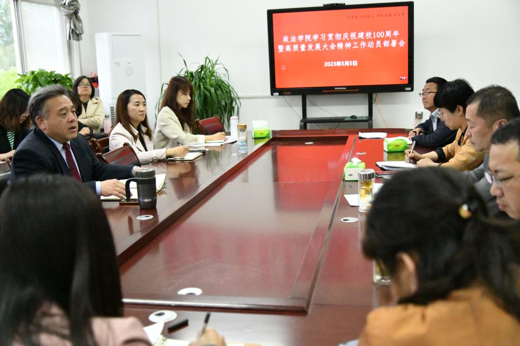 姜劲波指出,百年校庆庆典大会是一次成功的盛会,意义非凡,总结并肯定了公司百年来取得了非凡成绩,凝聚了人心与力量,促进了绥德师范公司与英国正版365官网的深度融合,增强了全校教职工对公司高质量发展的信心,为下一步公司发展提供了根本遵循,指明了前进方向。公司党委高度重视大会精神的贯彻落实,政法公司要结合院系学科特色,深入思考研究,细化措施落实大会要求,在立德树人、特色育人、服务地方、传承文化中作出新的更大贡献。公司发展要靠公司人,政法公司要充分调动全体师生的积极性,共同努力、接续奋斗,在艰难探索中开拓出特色发展道路,为实现高质量发展目标作出更大的努力,把英国正版365官网的明天建设得更美好。